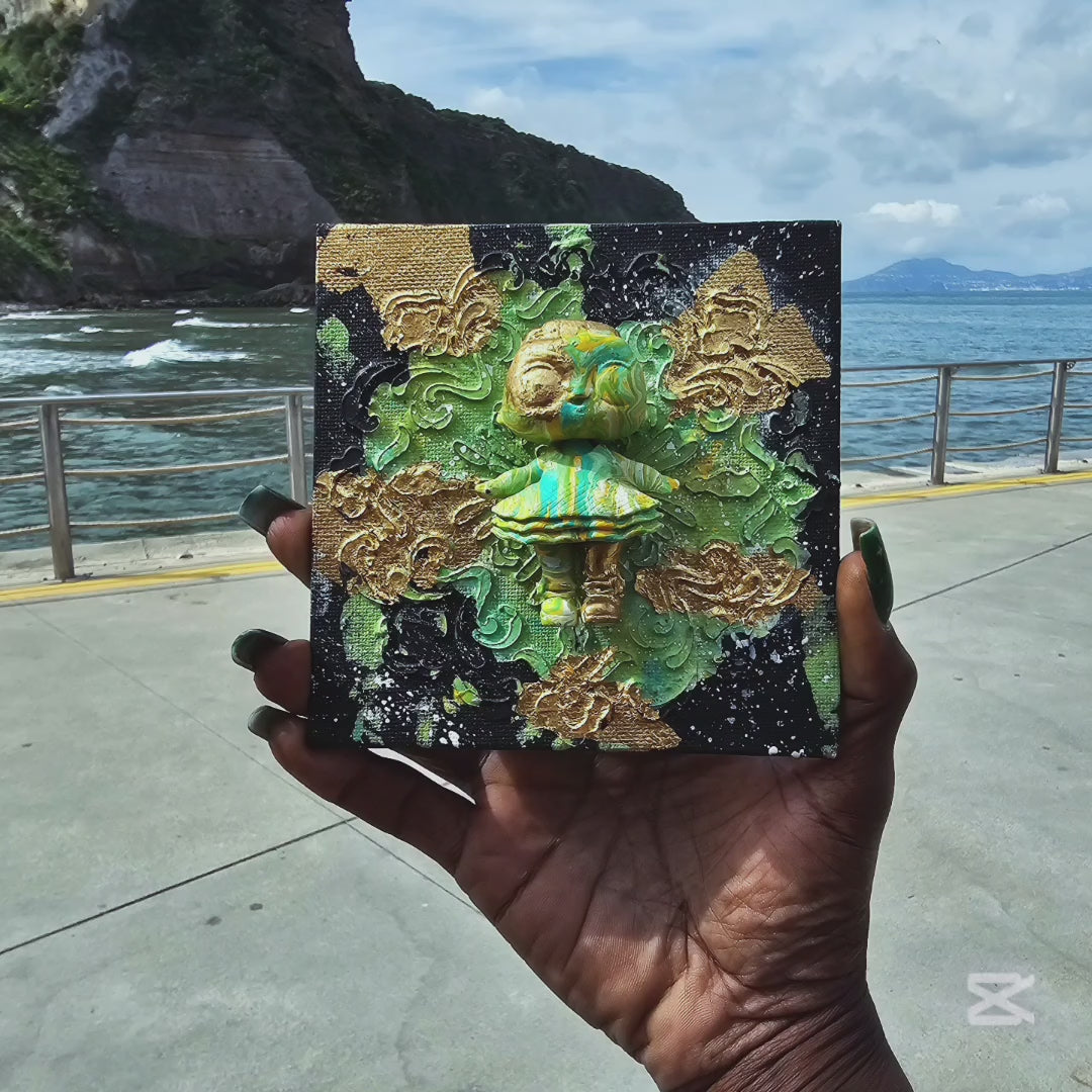 A piece where whimsical and sublime meet on a 12.5cm x 12.5cm canvas. It sparks conversation and playfulness with a 3D sculpture centerpiece that emerges from the canvas and seems to dance between celestial being and earthly bloom.