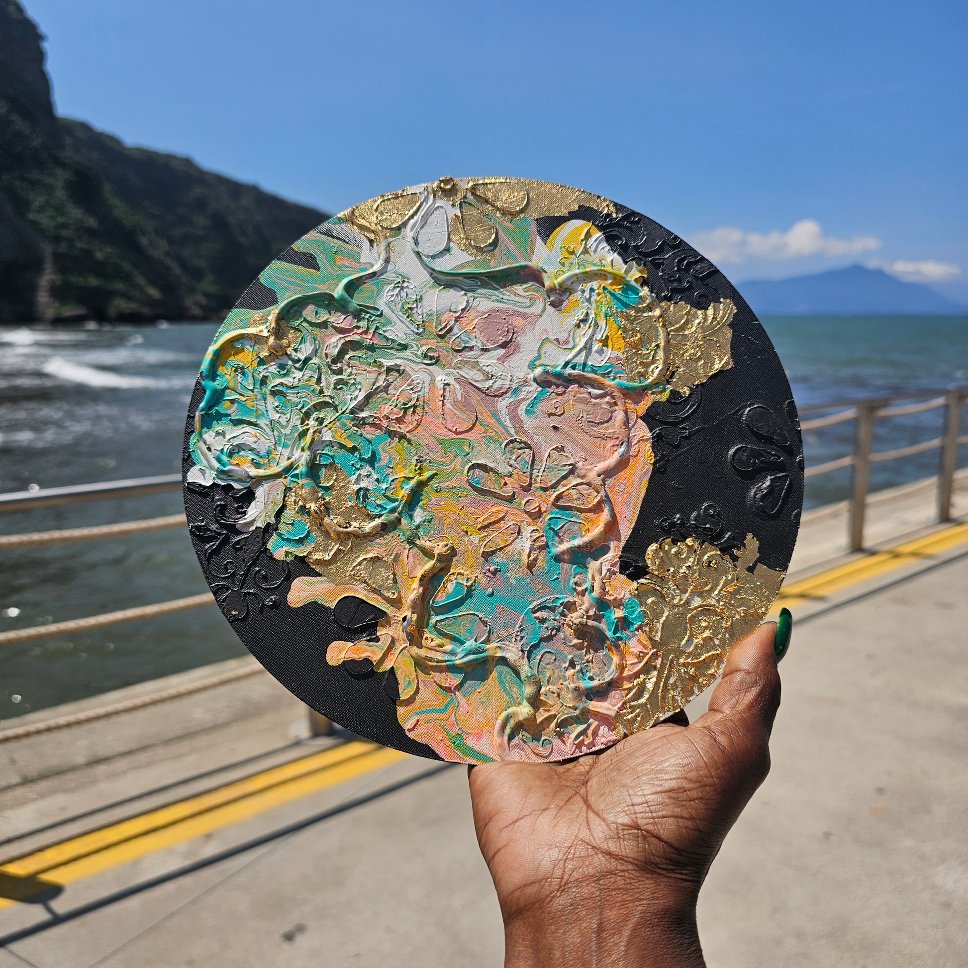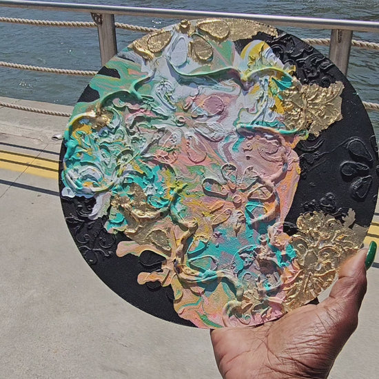 Bring elegance into your space into your space with this stunning handcrafted round abstract canvas. This sophisticated one-of-a-kind artwork spawned from using the fluid acrylic pour technique and it features mesmerizing colors of coral, lavender, peach, teal, and white that dance beautifully against a deep black backdrop. Gold leaf accents and adds luxury to the textured canvas. The colors and flow envoke movement along with imagination transforming any wall into a statement piece of contemporary art. This isn't just art but an invitation to step into a world of color, texture, and creativity.