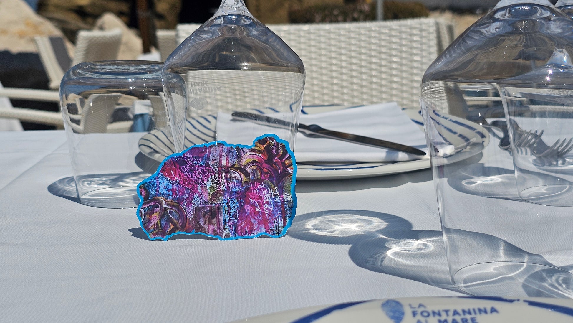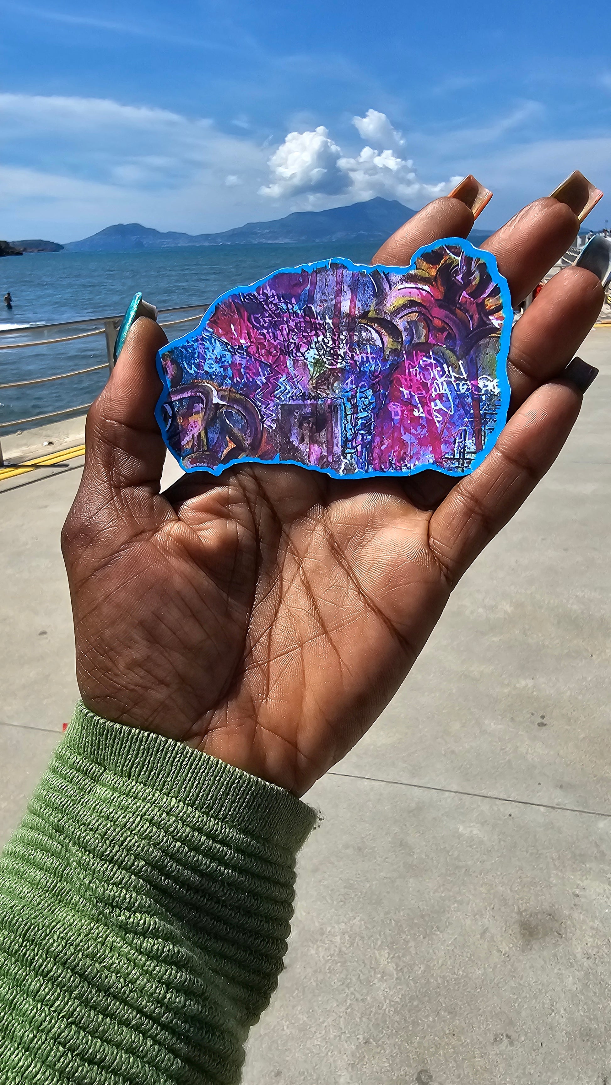 A medium sized hand cut matte sticker. The drawing itself is from a mixed media page. Ink, watercolor, acrylic was used in the creation of this page.