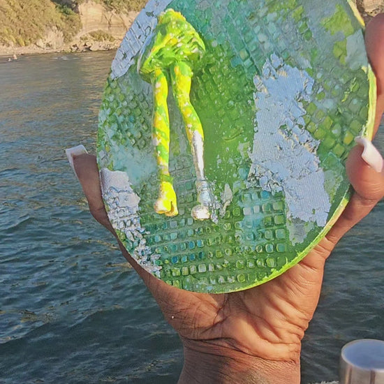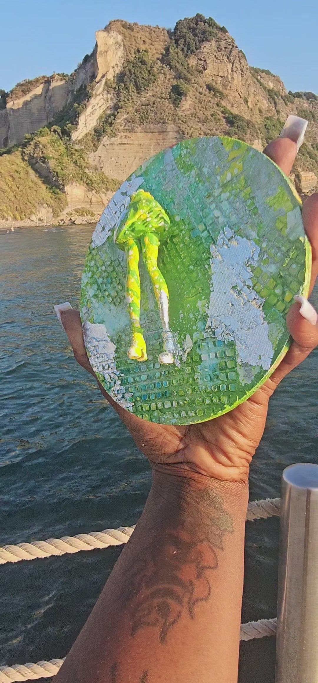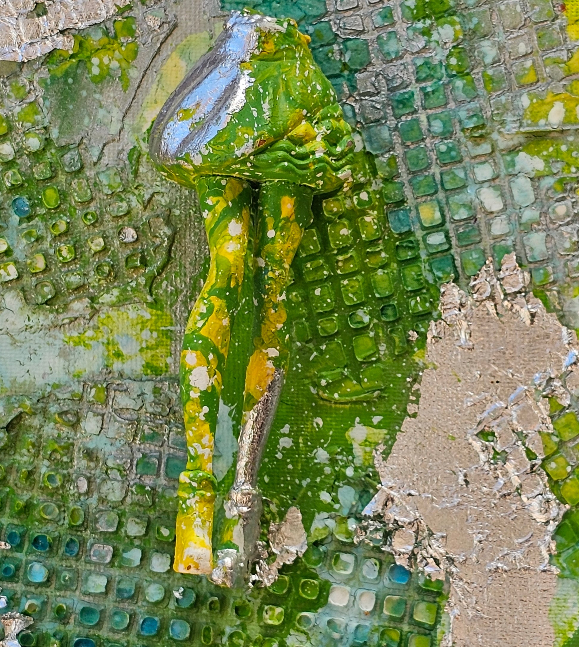Step into a world where texture and imagination dance together. Playfully step into surrealism that blurs the line between painting and sculpture. Legs that seem to stride out from the canvas as if walking from one realm to the next, an invite to wander between the abstract realities that exist in this half painting and half daydream. Lush shades of green and hints of yellow that envoke growth and renewal, while flashes of silver leaf glimmer like moonlight whispers on water. Whimsical and refined, this artwork carries a sense curiosity and quiet elegance. A conversation piece that feels alive with motion and mystery.